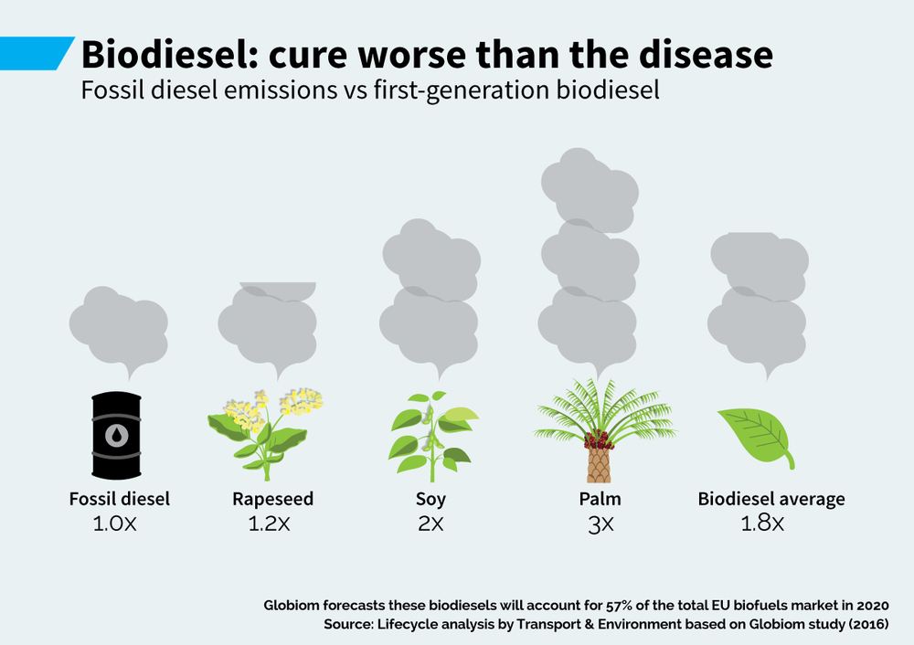 On average, biofuels produce 1.8x more emissions than fossil fuels while also introducing issues such as deforestation, loss of habitat and habitat fragmentation to grow these natural fuel sources. With an increase in large farms comes a decrease in natural habitat for wildlife, effectively destroying all biodiversity in these regions.