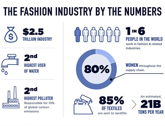 In 2015, the fashion sector generated 1.2 billion tons of greenhouse gases… this is more than all international flights and maritime shipping combined!!! This fact remains true in 2019, showing no improvement in emissions in at least four years… how crazy is that?! Greenhouse gases are not only emitting from factories, but being released from decomposing garments in land fills, acting as a huge contributor to global warming. The amount of methane being released into the atmosphere by unsustainable practices equates to the fashion industry using a quarter of the world’s carbon budget. Imagine how much better we could be caring for the earth if even 10% more of our population was not buying into fast fashion and instead was choosing to support more sustainable apparel brands. Luckily, something like fashion and the companies you’re supporting are easy changes to implement and can make huge impacts!